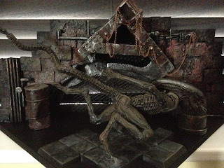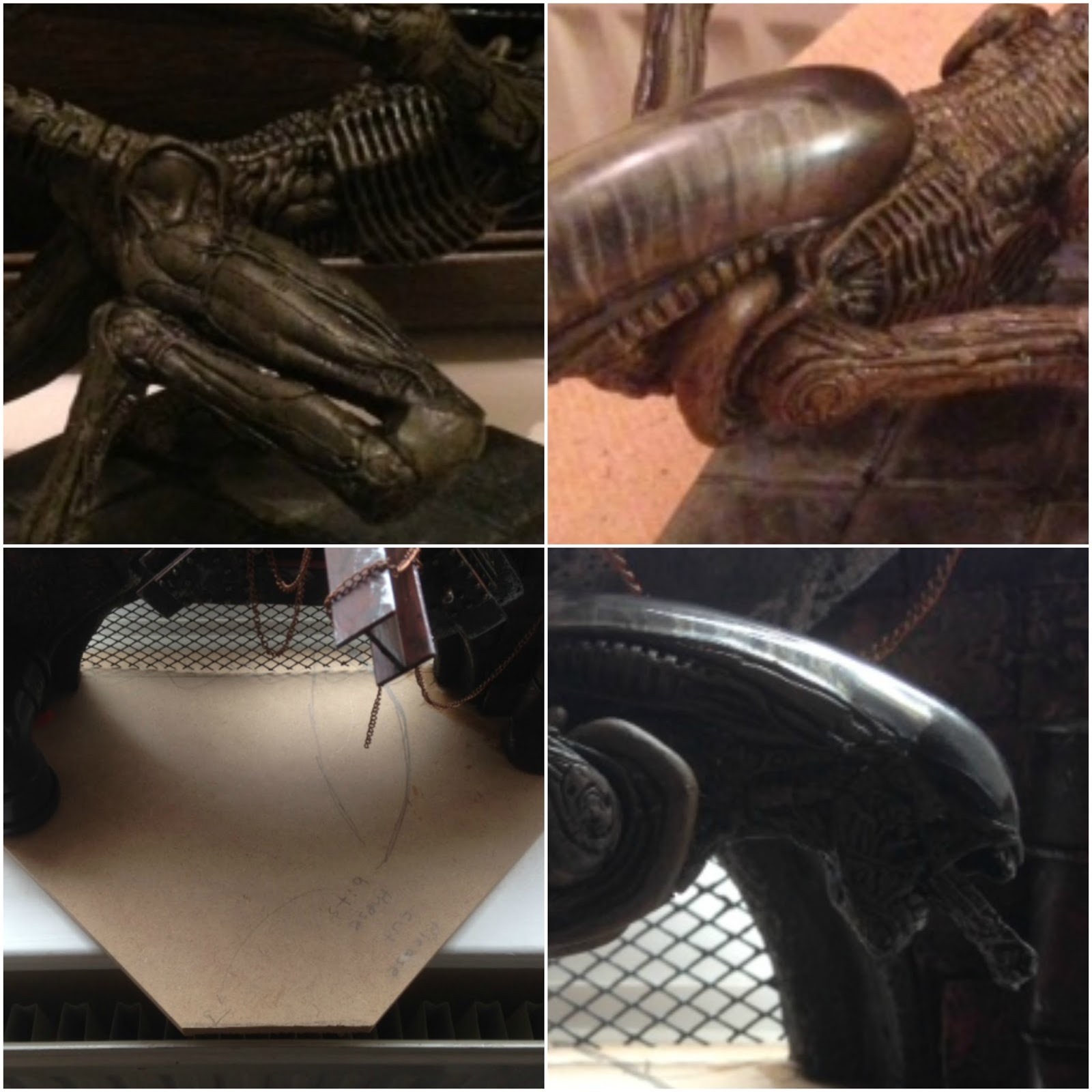 I examined a number of photo references from Alien 3, film stills, behind the scene pictures and other models and figurines. The colours seemed often contradictory, and the sepia lighting of the sets often just bathed everything in a brown hue. Finally I opted to begin with an olive green base coat. The second coat of paint was a tan brown, although I'm sure not to coat the thing entirely, so in areas the olive green still breaks through, especially on the fleshier parts. I base the backdrop (which couldn't support its own weight) onto a piece of MDF. It's cut so that it's wide enough for the whole wall, but cut into an angle that should compliment the alien's base. I add further highlights to the ribs, spine, shoulders, teeth, tongue and lips. I also use modeling putty to fill in the gaps between the dome and lips, and use black paint on each end of the dome.